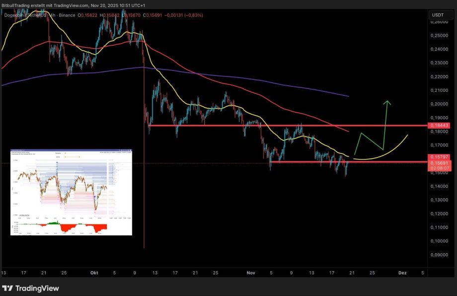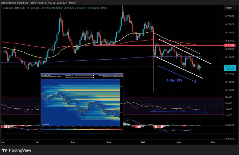 Diese Divergenz zwischen Preis und Momentum deutet auf nachlassenden Verkaufsdruck hin und kann ein frühes Indiz für eine potenzielle Gegenbewegung sein. Der übergeordnete Markt liefert hierfür aktuell leichte Unterstützung, da Bitcoin seine Abwärtsgeschwindigkeit reduziert hat, was auch DOGE etwas Entspannung verschafft. Eine technische Bestätigung dieser bullish wirkenden Divergenz erfolgt jedoch erst, wenn Dogecoin den 800 EMA oder zumindest den 50 EMA zurückerobert und dort Stabilität entwickelt.