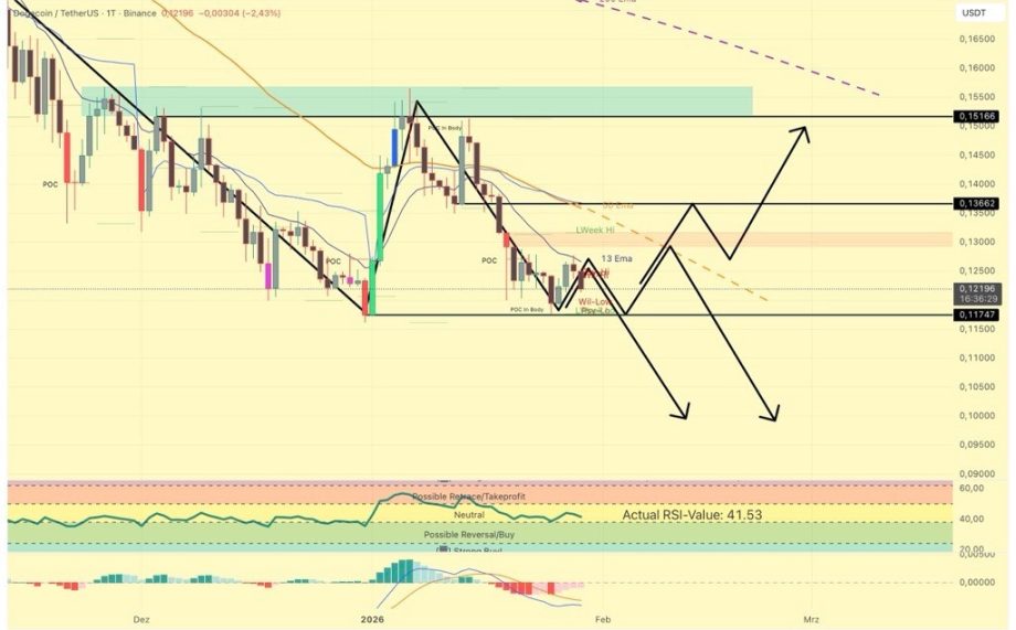Der Dogecoin-Kurs bleibt im Tageschart technisch angeschlagen. Insgesamt dominiert weiterhin ein bearishes Setup, auch wenn sich im unteren Kursbereich erste Stabilisierungstendenzen zeigen. Der Markt hat den Unterstützungsbereich bereits zum zweiten Mal angelaufen, scheitert aktuell jedoch erneut an dem 13-Tage-EMA, der als kurzfristiger dynamischer Widerstand fungiert.
