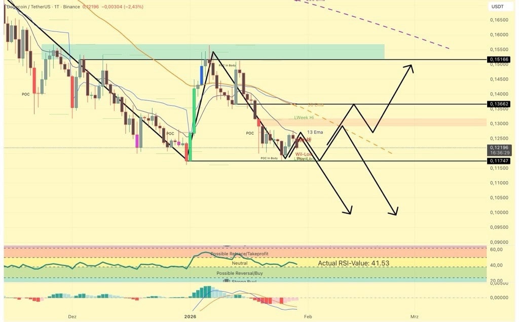 Mit der zuletzt ausgebildeten blauen Vektorkerze steigt die Wahrscheinlichkeit, dass DOGE den Unterstützungsbereich um 0,117 US-Dollar noch einmal anläuft. Ein erneuter Test dieser Zone könnte die Grundlage für einen kleinen doppelten Boden liefern, sofern der Verkaufsdruck weiter nachlässt.
