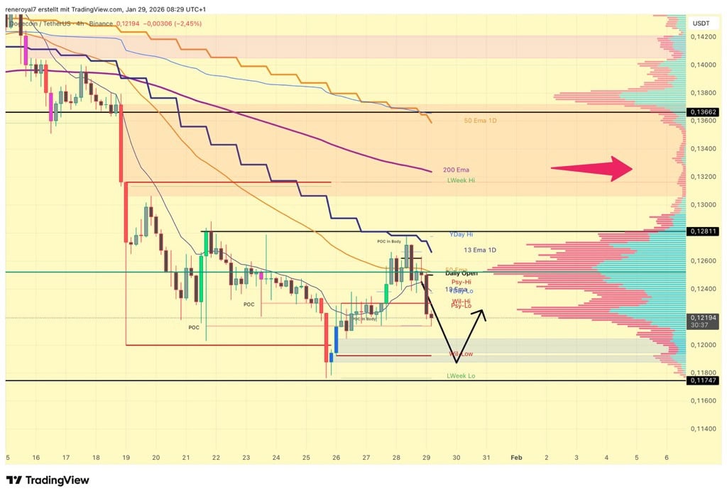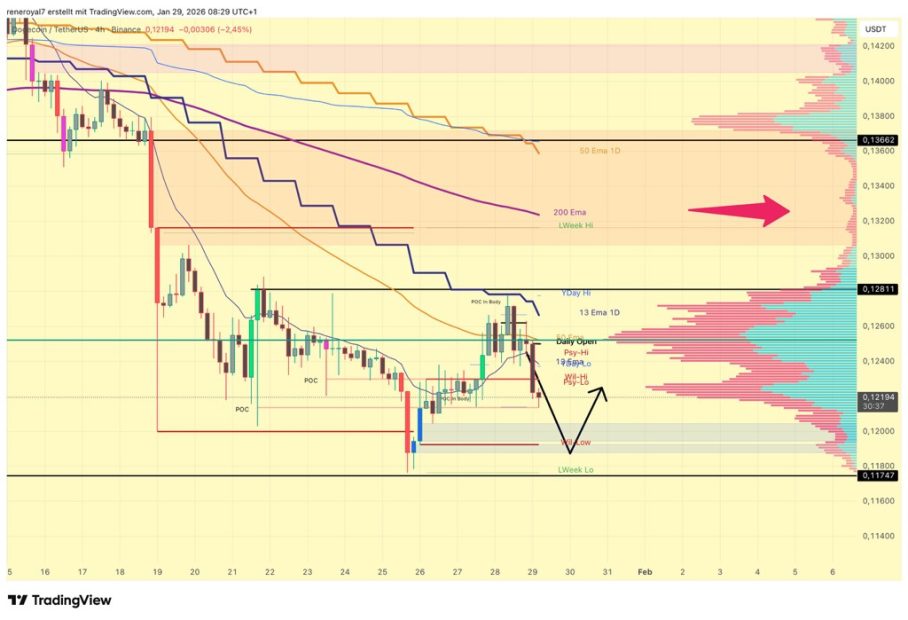 Im 4-Stunden-Chart bleibt Dogecoin kurzfristig unter Druck. Der Kurs scheiterte zuletzt daran, das oberhalb liegende Volumencluster nachhaltig zu überwinden. Diese Zone wirkt aktuell als Angebotsbereich und begrenzt jede Erholungsbewegung.