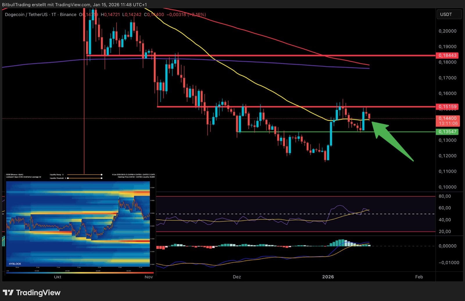 Das Liquidationsprofil (unten links im nachfolgenden Chart) verstärkt dieses Szenario zusätzlich. Oberhalb des letzten Hochs befindet sich eine ausgeprägte Liquiditätskonzentration, die als magnetischer Zielbereich für den Markt wirkt. Sollte der Kurs diese Zone anlaufen und die dort liegende Liquidität abholen, würde dies den notwendigen Orderflow Impuls liefern, um den Widerstand an der roten Linie nachhaltig zu überwinden. Unter der Voraussetzung, dass Bitcoin weiterhin konstruktiv bleibt, eröffnet sich für Dogecoin in diesem Fall der Weg in die nächste Expansionsphase mit potenziellem Lauf bis zur der EMA 200 und sogar der EMA 800 im Tageschart.