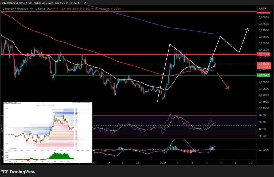 Auch im 4 Stunden Chart zeigt sich Dogecoin weiterhin in einer konstruktiven technischen Ausgangslage. Der Markt befindet sich in einer gesunden Strukturphase, in der kurzfristige Überhitzung bereits abgebaut wurde, ohne die übergeordnete bullishe Marktstruktur zu beschädigen.
