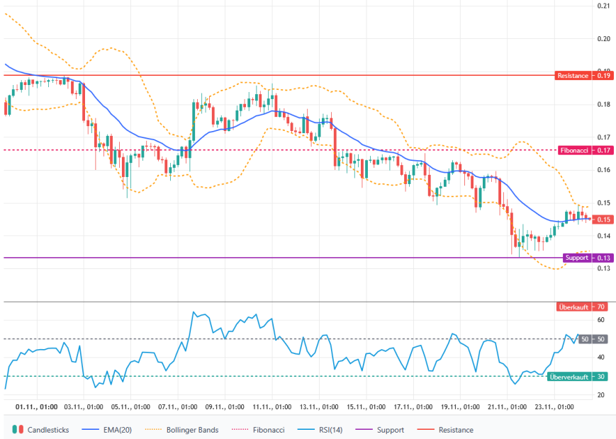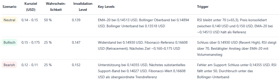 Die Gesamtbewertung ist daher neutral, mit leichter bullisher Neigung. Unterstützungen liegen bei 0,14355 US-Dollar und 0,14027 US-Dollar; Widerstände bei 0,14730 US-Dollar und 0,14930 US-Dollar. Ein sauberer Ausbruch über 0,14930 US-Dollar mit Bestätigung über dem EMA-20 könnte kurzfristig Raum bis etwa 0,160 US-Dollar eröffnen, während ein Bruch unter 0,14355 US-Dollar das bearishe Szenario aktiviert und Abgaben Richtung 0,120–0,110 US-Dollar möglich macht.