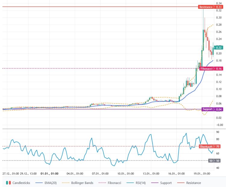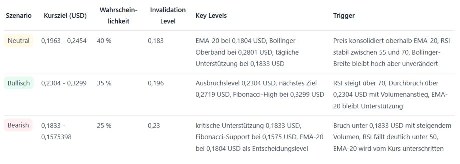 Der Kurs notiert oberhalb des EMA-20 (0,1804 USD) und damit in technischer Hinsicht über dem kurzfristigen Trendfilter; die Sequenz seit dem lokalen Hoch bei 0,3299 USD zeigt mehrere nachfolgende niedrigere Hochs, aber zuletzt einen Rebound von 0,1963 USD auf 0,2164 USD. Nahe Unterstützungen befinden sich bei 0,1833 USD und 0,1575 USD (Fibonacci), Widerstände bei 0,2304 USD und 0,2719 USD. Solange der Kurs oberhalb des EMA-20 verbleibt, bleibt die Lage technisch neutral bis leicht bullisch.