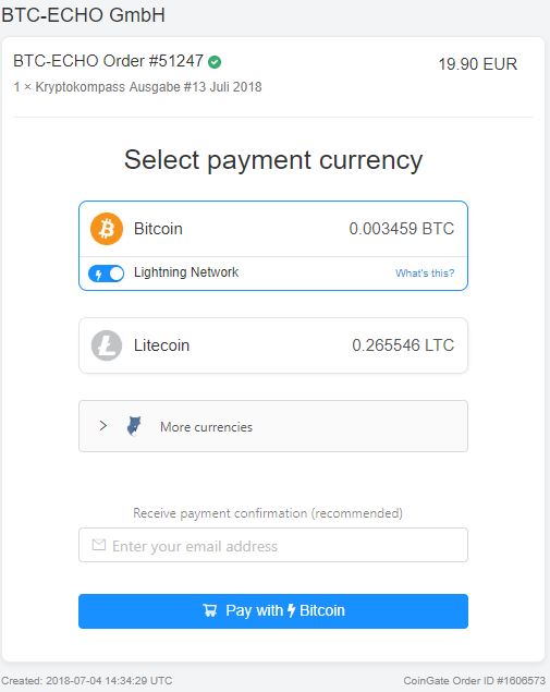 Übrigens: Auch BTC-ECHO ist Partner von Coingate. So kann man ab sofort in unserem Online-Shop Bitcoin-Zahlungen über das Lightning Network tätigen.