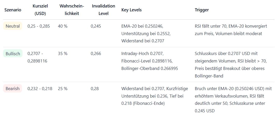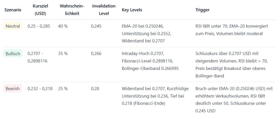 Der Kurs notiert klar oberhalb des EMA‑20 (0,250246 USD) und bildet eine Abfolge aus höheren Hochs und höheren Tiefs, was kurzfristige Stärke bestätigt. Unterstützungen liegen bei EMA‑20 ~0,25025 USD und dem Swing‑Low 0,2552 USD; Widerstände bei 0,2707 USD (intraday) und dem Fibonacci‑Level 0,2898 USD. Solange ENA über dem EMA‑20 bleibt, ist die Marktlage kurzfristig bullish.