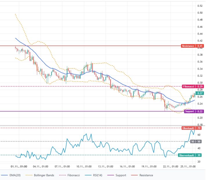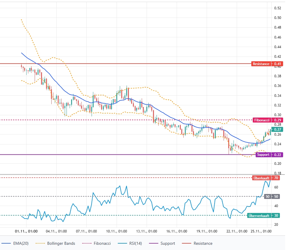 Die kurzfristige Prognose für ENA am 25.11.2025 ist bullish bei erhöhter Volatilität. Wichtige Unterstützungen liegen bei 0,25025 USD (EMA‑20) und 0,2552 USD; Widerstände bei 0,2707 USD und 0,2898 USD (Fibonacci, Abwärtstrend‑Level). Ein nachhaltiger Schlusskurs über 0,2707 USD mit steigendem Volumen öffnet den Weg Richtung 0,2898 USD; fällt ENA unter 0,25025 USD, ist ein Rücklauf bis 0,232–0,218 USD möglich. Du solltest Stop‑Loss‑Niveaus unter 0,245 USD prüfen und auf bestätigte Volumensignale warten.