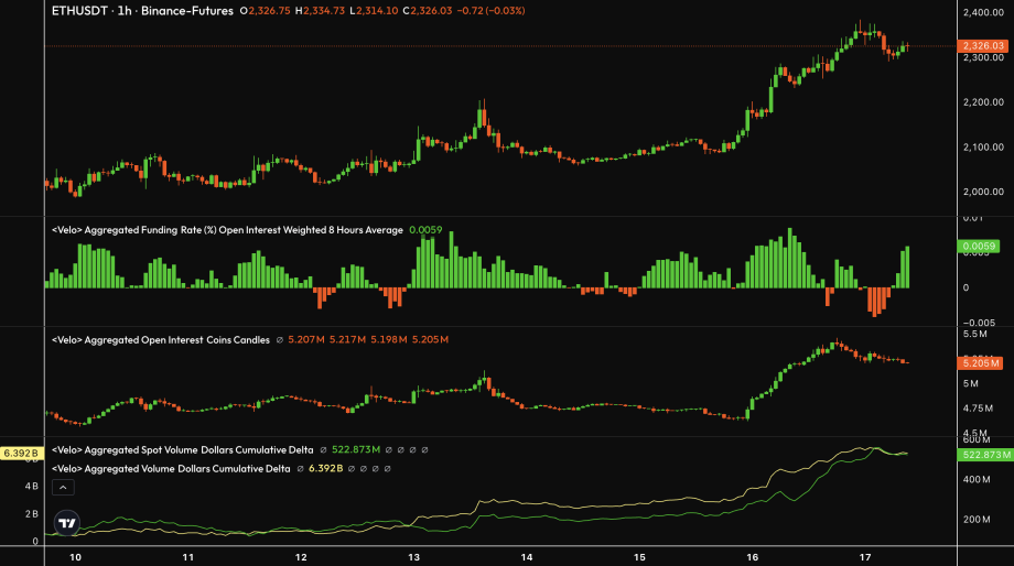 Ein Blick auf die Orderflow-Daten zeigt, dass zunehmend Long-Positionen in den Markt kommen. Die Fundingrate steigt und auch das Open Interest zieht weiter an, was darauf hindeutet, dass neue Positionen aufgebaut werden.
