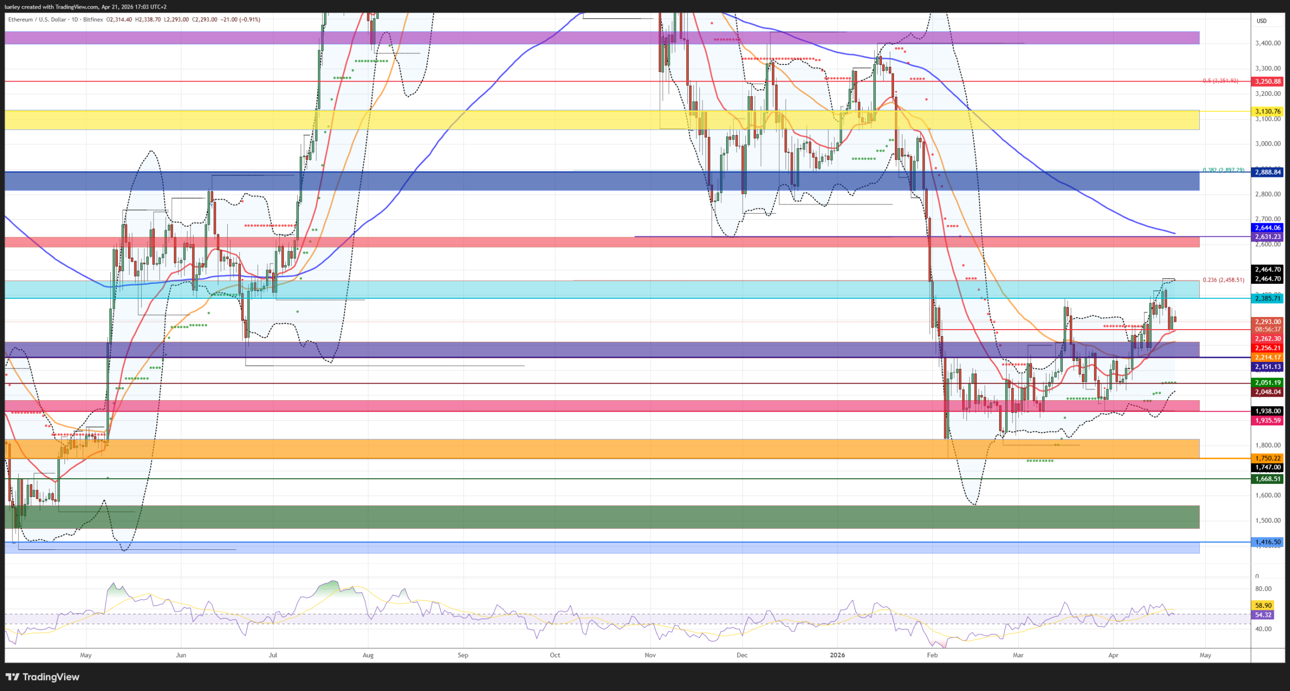 Charttechnisch müssen die Bullen daher versuchen, das Wochentief im Bereich der EMA20 bei 2.262 US-Dollar zu verteidigen. Ein erneuter Angriff in Richtung der türkisen Widerstandszone würde die Chance auf eine bullishe Trendfortsetzung weiter verbessern. Erst ein Tagesschlusskurs oberhalb des 23er Fibonacci-Retracements würde frisches Anstiegspotenzial aktivieren. Ein Rückfall auf neue Wochentiefs würde die EMA50 bei 2.215 US-Dollar in den Fokus rücken. Gibt der Ether-Kurs diesen gleitenden Support auf, ist ein Retest der Unterkante des violetten Supportbereichs bei 2.151 US-Dollar wahrscheinlich.
