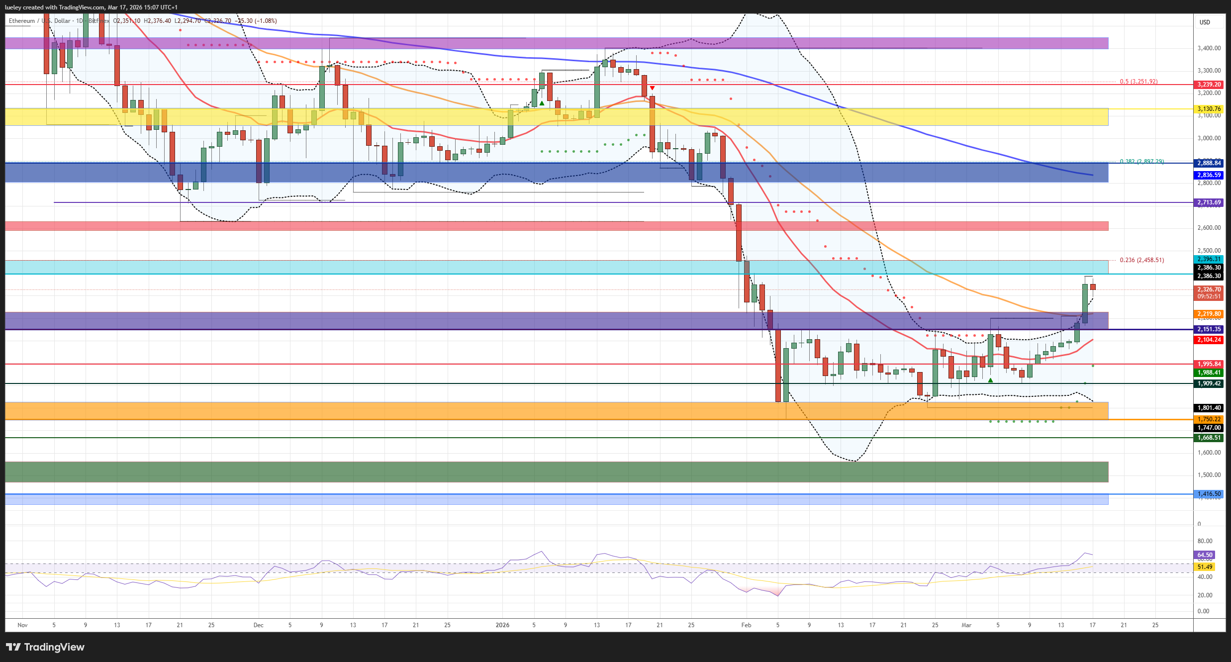 Erneut ist mit Gegenwehr der Bären zu rechnen. Zeigt sich Ethereum weiter bullish und pulverisiert diese wichtige horizontale Marke bei 3.239 US-Dollar, dürfte das Käuferlager alles daran setzen die violette Zone, um das Jahreshoch anzulaufen. Im Dezember 2025 und Januar 2026 stellte der Bereich zwischen 3.398 US-Dollar und 3.448 US-Dollar eine unüberwindbare charttechnische Hürde dar. Aus aktueller Sicht fungiert diese Zielmarke das maximale Kursziel auf der Oberseite.
