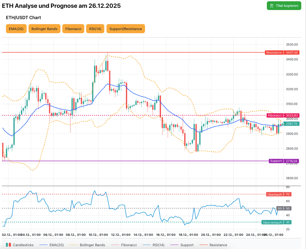 Die kurzfristige Prognose für ETH am 26.12.2025 ist neutral bis leicht bullisch. Relevante Unterstützungen liegen bei 2.953,40 USD (EMA-20) und 2.891,20 USD; unmittelbare Widerstände bei 2.994,38 USD und 3.023,82 USD (Fibonacci, Abwärtstrend). Ein stabiler Tagesschluss über 3.023,82 USD würde das Momentum deutlich auflockern und Raum Richtung 3.200 USD eröffnen; ein Bruch unter 2.891,20 USD dürfte hingegen zu beschleunigter Abwärtsbewegung führen. Du solltest die Reaktion an EMA-20 und am Fibonacci-Level beobachten, um das Risiko pro Trade zu begrenzen.