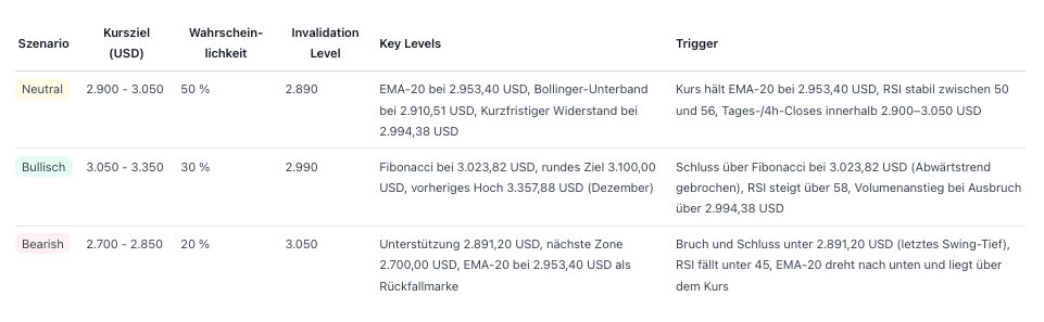 Der Kurs notiert knapp über dem EMA-20 (2.953,40 USD) und zeigt zuletzt eine Folge annähernd gleicher Hochs mit leicht höheren Tiefs, was kurzfristig eine neutrale bis leicht bullishe Struktur signalisiert. Unterstützungen liegen bei 2.953,40 USD (EMA-20) und 2.891,20 USD (letztes Swing-Tief), Widerstände bei 2.994,38 USD und dem Fibonacci-Level bei 3.023,82 USD. Solange der Kurs zwischen EMA-20 und 3.023,82 USD bleibt, ist die technische Marktlage neutral.