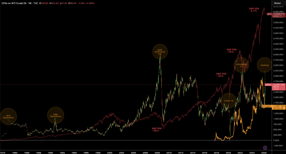 Historisch gingen starke Ölpreisschübe häufig mit Phasen wirtschaftlicher Schwäche und schwächeren Risikoassets einher. Deshalb ist der Blick auf Energiepreise für Bitcoin derzeit so wichtig. Wenn Öl und Gas steigen, Inflationserwartungen anziehen und Zentralbanken wieder restriktiver denken, geraten Aktienmärkte und Krypto meist gleichzeitig unter Druck.