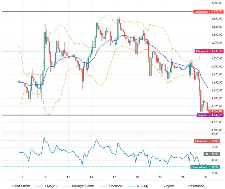 Ein nachhaltiger Ausbruch über 4.748,48 US-Dollar könnte neues Aufwärtsmomentum freisetzen. Steigendes Volumen, ein RSI über 50 und ein Schlusskurs oberhalb des EMA-20 würden die Chancen auf eine Bewegung in Richtung 4.900 US-Dollar erhöhen.