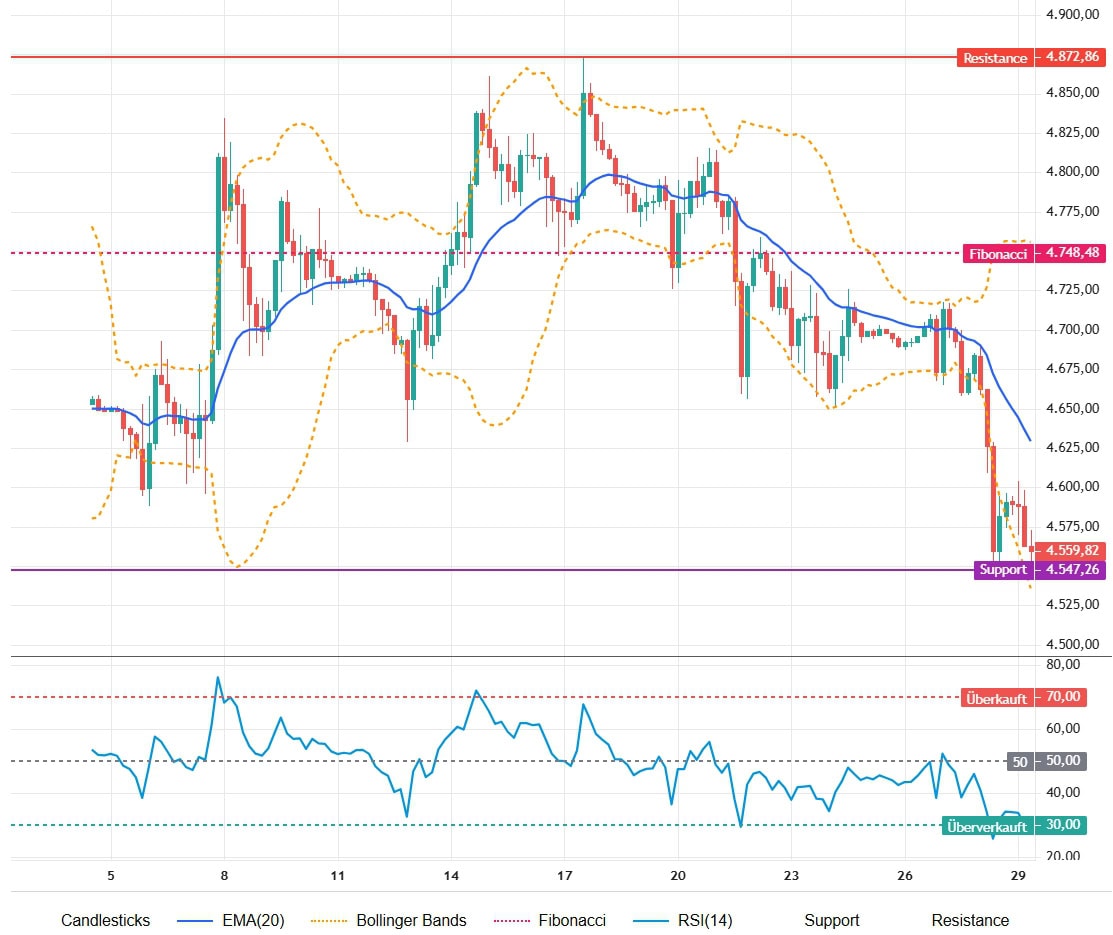 Der Kurs notiert klar unter dem EMA-20 (4.629,31 US-Dollar), und die Abfolge von tieferen Hochs und tieferen Tiefs bestätigt kurzfristige Schwäche. Unterstützungen liegen bei 4.547,26 US-Dollar (tagesaktives Tief) und rund 4.500,00 US-Dollar; unmittelbare Widerstände bei 4.629,31 US-Dollar (EMA-20) und dem Fibonacci-Level bei 4.748,48 US-Dollar. Solange der Kurs unter dem EMA bleibt, ist die Marktlage neutral bis leicht bärisch.
