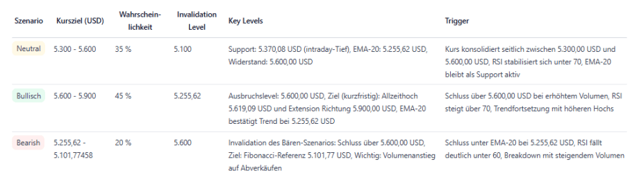 Widerstände befinden sich bei 5.600,00 USD und dem Allzeithoch 5.619,09 USD; ein Schluss über 5.600,00 USD mit Volumen würde ein Ausbruchssignal bestätigen. Fällt der Kurs unter 5.255,62 USD, ist mit erhöhter Volatilität und Testen der Fibonacci-Region um 5.101,77 USD zu rechnen.