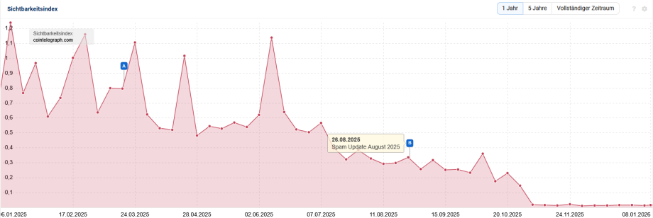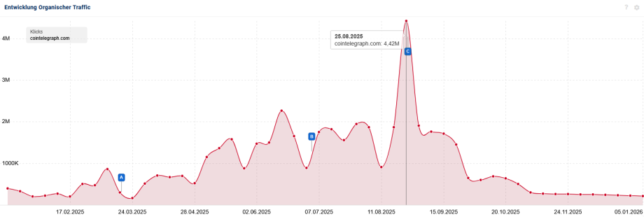 Tatsächlich scheint die Nachrichtenseite schon mindestens seit Oktober 2025 nicht mehr in den Suchergebnissen von Google aufzutauchen. Für ein Medienunternehmen, das von der Online-Reichweite seiner Beiträge betriebswirtschaftlich abhängig ist, gleicht das einem Todesurteil. Unabhängige Analysen auf YouTube, LinkedIn und im Netz sprechen von einem Rückgang von 90 bis 98 Prozent des sogenannten “Traffics”, also der Anzahl des Besucherstroms. Zum Vergleich: Das Analyse-Tool Sistrix schätzt, dass Cointelegraph im August in den USA noch einen Traffic von über vier Millionen Aufrufen erzielte. Ende Dezember waren es nur noch etwas mehr als 223.000.