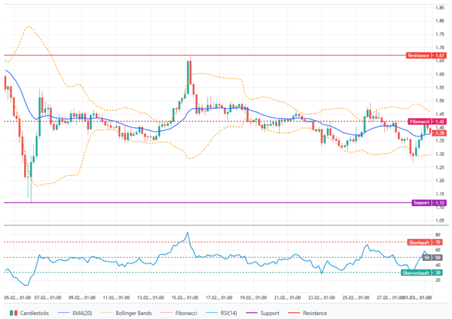 Die kurzfristige Prognose für XRP am 01.03.2026 bleibt neutral mit leichter bärischer Tendenz. Wichtige Unterstützungen liegen bei 1,3505 USD und 1,2933 USD; relevante Widerstände bei 1,4185 USD und 1,4333 USD.