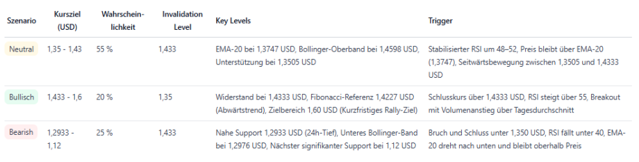 Der Kurs notiert knapp über dem EMA-20 (1,3747) und zeigt dennoch eine Sequenz aus tieferen Hochs und tieferen Tiefs seit dem Intraday-Hoch 1,4333 USD. Entscheidende Unterstützungen befinden sich bei 1,3505 USD und 1,2933 USD, Widerstände bei 1,4185 USD und 1,4333 USD. Solange XRP unter 1,4333 USD konsolidiert, bleibt die kurzfristige Marktlage neutral mit leichtem bärischen Bias.