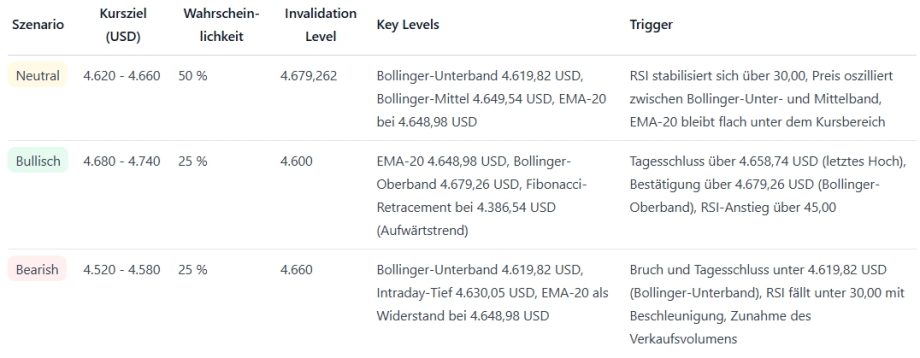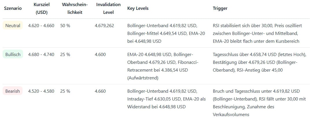Kurzfristig bleibt die Prognose neutral bis leicht bärisch: Preis unter EMA-20, schwaches Momentum und enge Bänder. Unterstützungen liegen bei 4.619,82 US-Dollar (Bollinger-Unterband) und 4.630,05 US-Dollar (Intraday-Tief); unmittelbare Widerstände bei 4.648,98 US-Dollar (EMA-20) und 4.658,74 US-Dollar (letztes Hoch). Ein nachhaltiger Ausbruch über 4.658,74 US-Dollar mit Bestätigung über 4.679,26 US-Dollar (Bollinger-Oberband) würde bullische Entspannung schaffen. Fällt der Kurs klar unter 4.619,82 US-Dollar, wäre mit beschleunigter Abgabe und Zielzonen tiefer bei 4.520 bis 4.580 US-Dollar zu rechnen.
