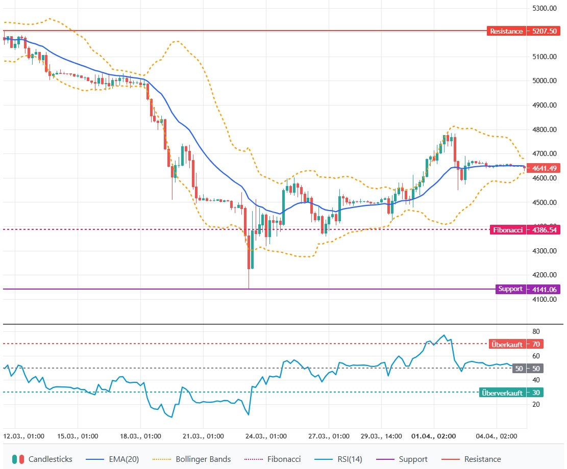 Der Kurs notiert knapp unter dem EMA-20 (4.648,98 US-Dollar) und zeigt Intraday eine Abfolge leicht absteigender Hochs und Tiefs. Naheliegende Unterstützung liegt am Bollinger-Unterband bei 4.619,82 US-Dollar sowie beim Intraday-Tief 4.630,05 US-Dollar; Widerstände bei 4.648,98 US-Dollar (EMA-20) und 4.658,74 US-Dollar (letztes Hoch). Solange der Kurs unter dem EMA-20 verbleibt, ist die Marktlage technisch neutral bis leicht bärisch.