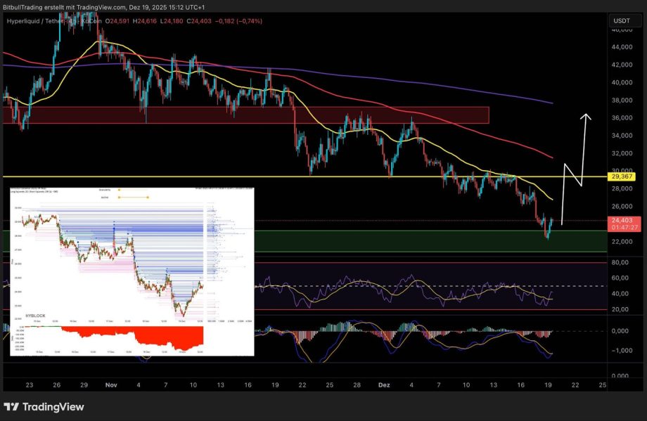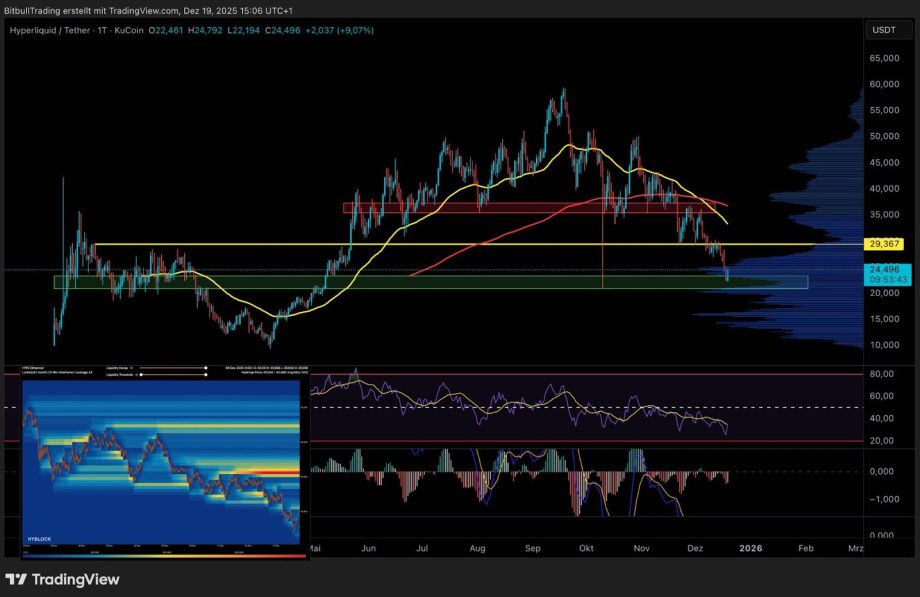 Der RSI (Relative Strength Index) notiert im Tageschart tief im überverkauften Bereich. Zwar liegt noch kein klares bullish Signal vor, jedoch ist erkennbar, dass das negative Momentum kontinuierlich nachlässt. Diese Konstellation spricht für eine mögliche Stabilisierungsphase oder eine technische Erholung, sofern das Gesamtmarktumfeld unterstützend wirkt. Insgesamt befindet sich HYPE damit an einem technisch relevanten Wendepunkt, bei dem starker Support, abgearbeitete Abwärtsliquidität und nachlassender Verkaufsdruck erste konstruktive Ansätze liefern. Eine nachhaltige Erholung bleibt jedoch eng an eine Stabilisierung von Bitcoin gekoppelt.