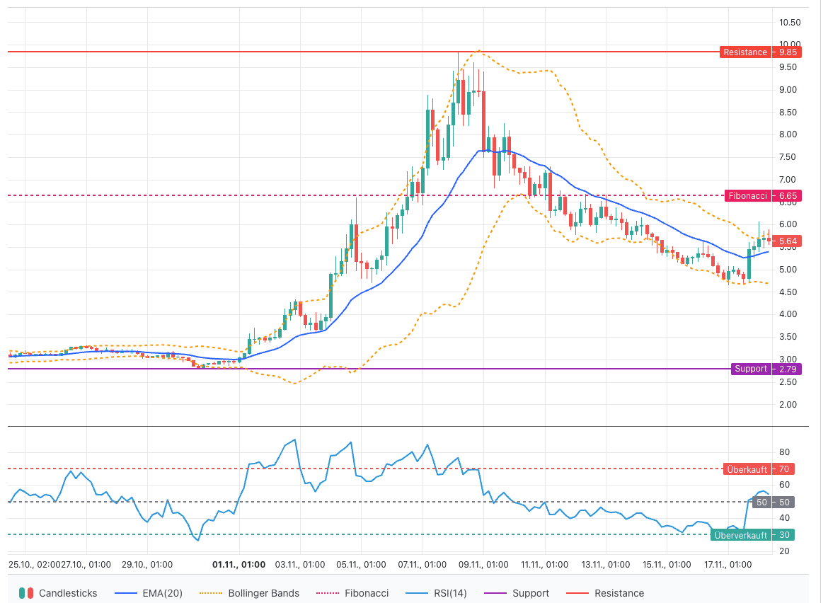 In den letzten zwölf bis 24 Stunden pendelte der Kurs zwischen 5,39 USD (Tief) und 6,06 USD (Hoch) und schloss zuletzt bei 5,63 USD. Gegenüber dem Vortag (24h davor: Schlusskurs 4,89 USD) ist der Kurs deutlich höher, was auf eine kurzfristige Wiederaufnahme der Aufwärtsbewegung hinweist. Die Marktkapitalisierung liegt bei etwa 3,05 Milliarden USD und gibt dem Coin mittelgroße Marktrelevanz im Krypto‑Jahr 2025. Für Dich als Anleger bleibt die unmittelbare Lage datengetrieben und auf Preis‑ und Volumenreaktionen fokussiert.