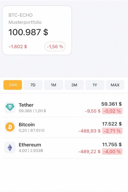 Redaktioneller Hinweis: Mit dem BTC-ECHO-Musterportfolio wollen wir euch eine Hilfestellung geben und bilden alle Kauflevels, Zielmarken und Transaktionen transparent ab – inklusive Historie, Performance-Tracking und strategischer Einordnung. Marktexperte Stefan Lübeck – seit über zehn Jahren als Trader und Chartanalyst tätig – ist der aktive Manager des Portfolios. Dieser Artikel stellt keine Anlageberatung dar und dient ausschließlich zu Informationszwecken.