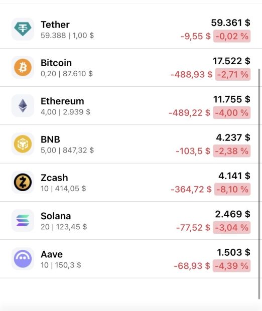 Das Musterportfolio ist unverändert in sechs Coins investiert. Neben der nach Marktkapitalisierung größten Kryptowährung Bitcoin (BTC) befinden sich weiterhin Positionen in Ethereum (ETH), Solana (SOL) und Aave (AAVE) sowie Binance Coin (BNB) und Zcash (ZEC) im Depot. Zu knapp 60 Prozent ist das Investitionskapital weiterhin im Stablecoin Tether (USDT) angelegt. Der hohe “Cash”-Bestand scheint sich im Zuge der aktuellen Kursrücksetzer auszuzahlen. Infolge der jüngsten Kurskonsolidierung weist das Portfolio einen überschaubaren Kursverlust von 1,5 Prozent auf.