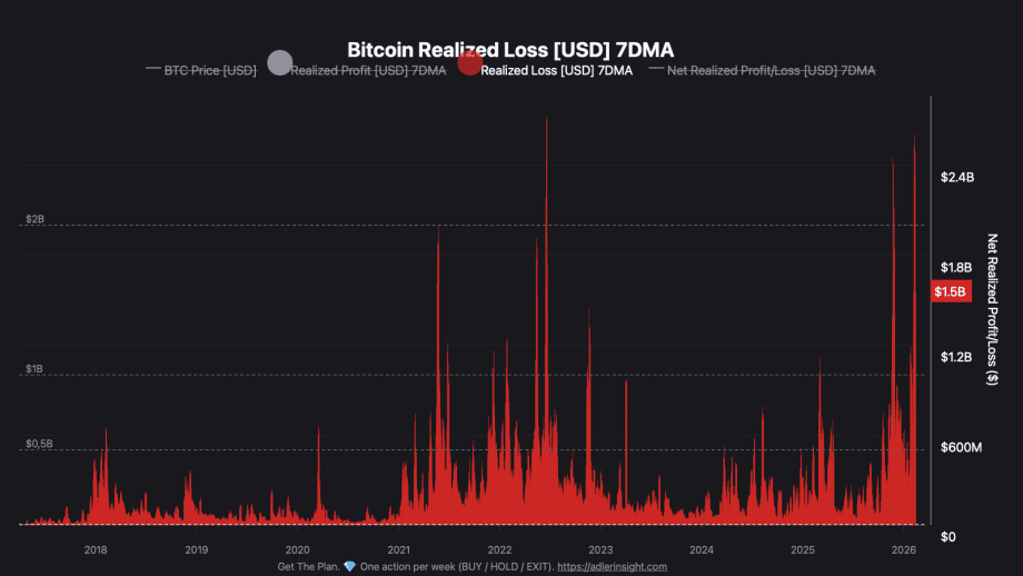 Ein zusätzlicher Stressindikator wird von den On-Chain-Daten aufgedeckt, denn im siebentägigen gleitenden Durchschnitt der realisierten Verluste zeigt sich ein Spike auf rund 2,6 Milliarden US-Dollar. Solche Ausschläge sieht man historisch nur in wenigen Marktstressphasen, etwa rund um 2021, während der Luna/FTX-Verwerfungen oder in der Korrektur Mitte 2024. Das passt ins Gesamtbild: Viele Anleger schließen unter Druck Positionen und realisieren Verluste.