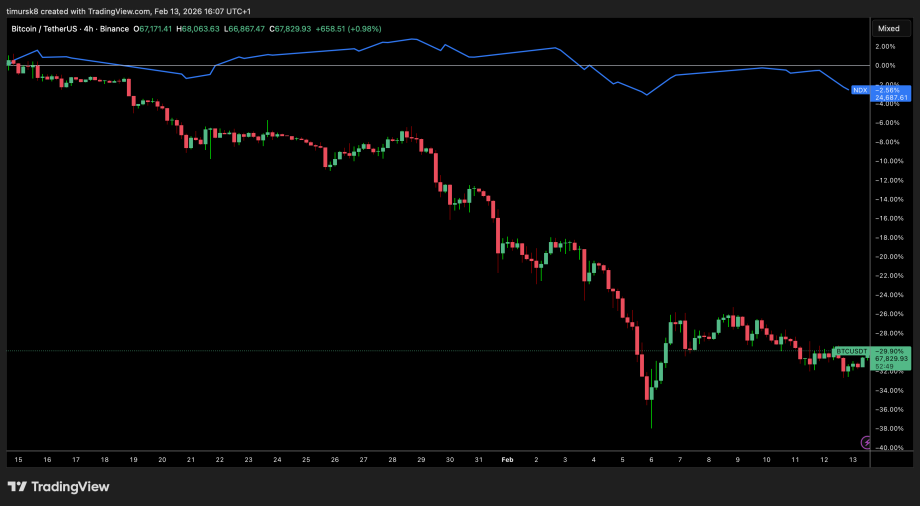 Nasdaq 100 vs. Bitcoin (30 Tage): Tech korrigiert moderat, BTC fällt deutlich stärker | Quelle: TradingView