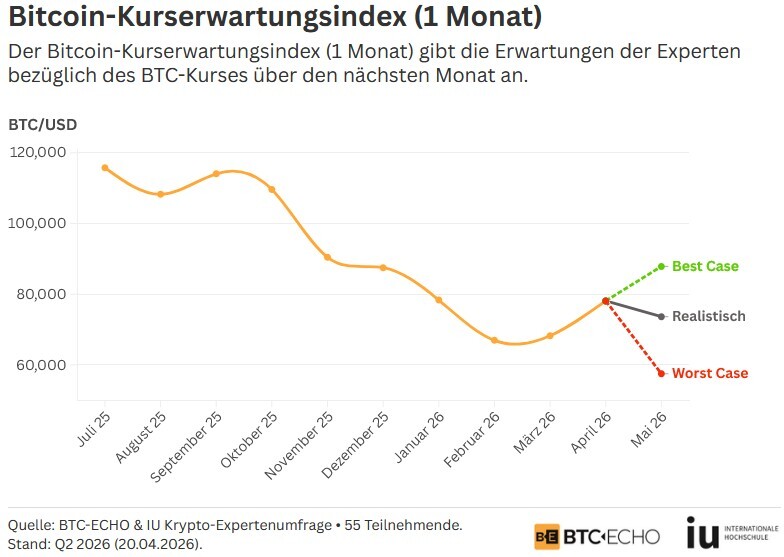 Aus den Umfragedaten wird ebenfalls der BTC-6M-Volatilitäts-Index berechnet. Dieser fasst die durchschnittliche erwartete Volatilität des BTC-Kurses über sechs Monate zusammen. Der Indexstand liegt bei 29,6 Punkten und damit über den 25,8 Punkten aus Q1 2026. Die historische Volatilität des BTC-Kurses vor der Umfrage über sechs Monate beträgt 30,4 (basierend auf täglichen log-Renditen im Zeitraum 13.04.2025 – 19.04.2026).