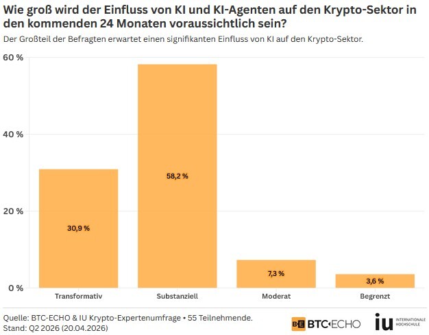 Unsere Umfrage zeigt, dass 90 Prozent der befragten Insider einen substanziellen oder gar transformativen Einfluss von KI auf den Krypto-Sektor in den kommenden 24 Monaten erwarten. Dieses Ergebnis unterstreicht, wie signifikant KI und KI-Agenten bereits zeitnah die Branche verändern können.