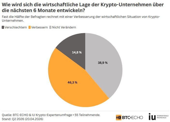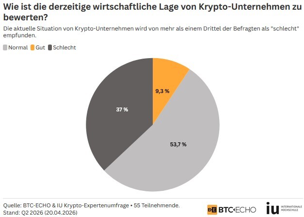 Lediglich 9,3 Prozent sehen die aktuelle wirtschaftliche Situation der Krypto-Unternehmen als gut an. Im vorherigen Quartal (Q1 2026) waren es noch 23,8 Prozent und davor, im 4. Quartal 2025, sogar ganze 68,6 Prozent. Dafür steigt der Anteil der negativen Einschätzungen von 7,1 Prozent im Vorquartal auf nun 37 Prozent. Die Krise im Krypto-Sektor hat sogar dazu geführt, dass der Indexstand erstmalig ins Negative gedreht ist. Von 16,7 Prozent im vorherigen Quartal auf nun – 27,8. Der Index wird berechnet, indem der Prozentsatz der positiven Bewertungen von dem Prozentsatz der negativen Bewertungen abgezogen wird.