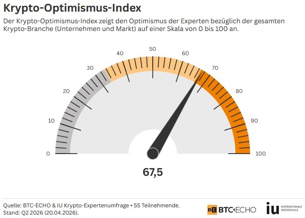 Wie optimistisch blicken unsere Insider auf die Krypto-Branche? Anhand einer Skala von 0 bis 100 haben wir einen Krypto-Optimismus-Index entwickelt, der darüber Aufschluss geben soll. Im Vergleich zum vorherigen Quartal (Q1 2026) ist der Optimismus weiter zurückgegangen, von 71,2 auf inzwischen 67,5 Indexpunkte. Dabei waren 40 Prozent optimistischer, 34,5 Prozent weniger optimistisch und 25,5 Prozent sahen keine Veränderung in ihrem Optimismus im Vergleich zum vorherigen Quartal.