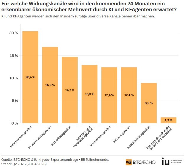 Der wichtigste Wirkungskanal für den Sektor liegt laut Insidern im Informationsgewinn. Gefolgt vom Produktivitätsgewinn und dem Sicherheitsgewinn an dritter Stelle. Gerade der Sicherheitsaspekt ist angesichts der DeFi-Hacks besonders spannend. Einerseits stellt KI ein massives Sicherheitsrisiko für den Sektor dar, andererseits kann sie aber auch zu einem Mehr an Sicherheit beitragen, z.B. durch KI-Audits.