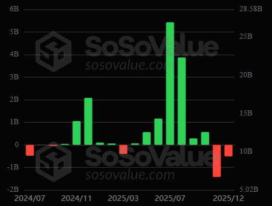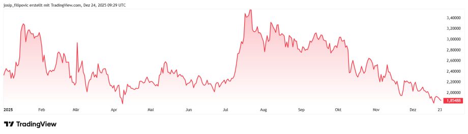 Doch auch hier zeigte sich gegen Jahresende eine klare Abkühlung. Seit November verzeichneten die ETFs der zweitgrößten Kryptowährung Abflüsse von über 1,8 Milliarden US-Dollar. Anleger wurden vorsichtiger, Makrorisiken rückten wieder stärker in den Vordergrund.
