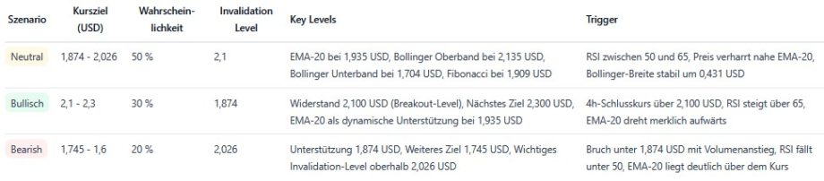 Ein nachhaltiger Ausbruch über 2,10 US-Dollar könnte kurzfristig weiteres Potenzial in Richtung 2,30 US-Dollar eröffnen. Das wäre das bullishe Szenario. Fällt der Kurs dagegen nachhaltig unter 1,87 US-Dollar, steigt die Wahrscheinlichkeit einer Abwärtsbewegung in den Bereich zwischen 1,60 und 1,70 US-Dollar.