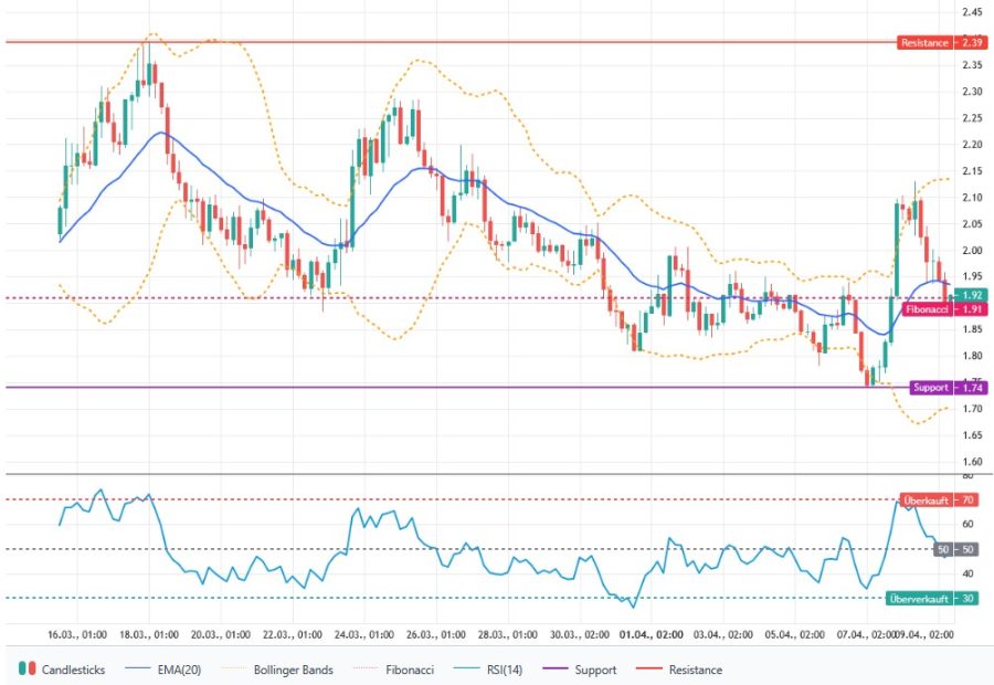 Der Kurs notiert aktuell knapp unter dem EMA-20, der bei 1,94 US-Dollar verläuft, und zeigt kurzfristig wechselnde Hochs und Tiefs bei leichter Schwäche. Wichtige Unterstützungen liegen bei 1,87 US-Dollar und 1,75 US-Dollar. Widerstände befinden sich bei 2,03 US-Dollar und 2,10 US-Dollar. Das Fibonacci-Retracement bei 1,91 US-Dollar deutet innerhalb der betrachteten Handelsspanne weiterhin auf einen Aufwärtstrend hin. Solange der Kurs unter dem EMA-20 bleibt, ist das technische Bild neutral mit leicht negativer Tendenz.