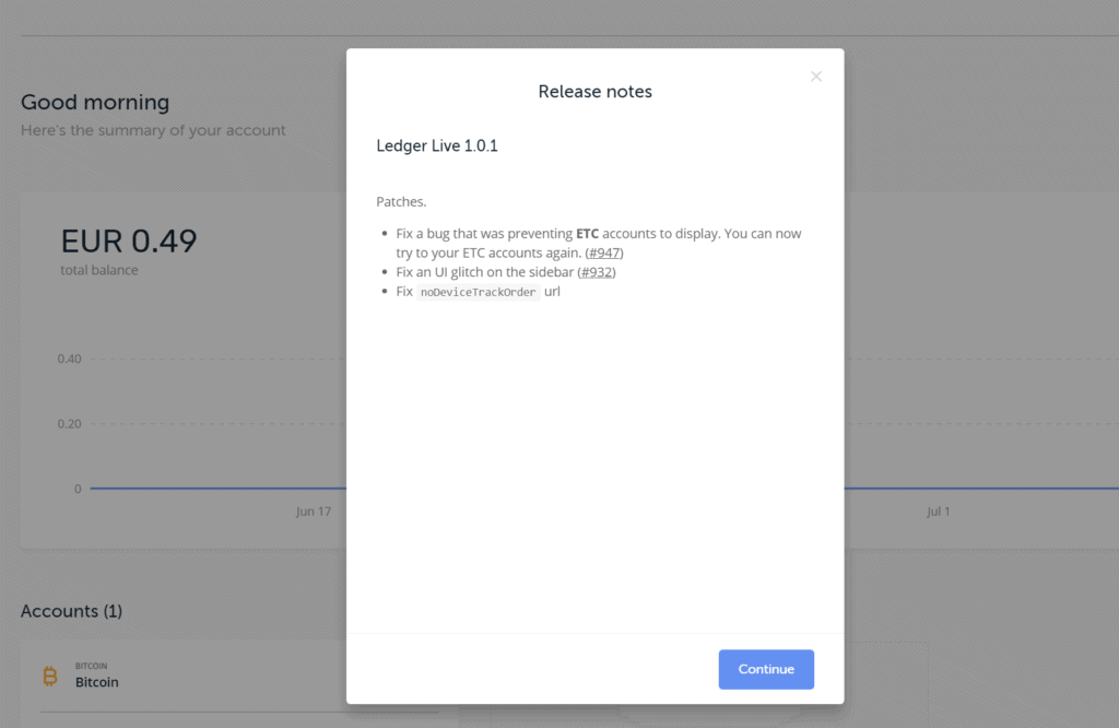 Wenige Stunden nach der Veröffentlichung der Version 1.0.0 kam übrigens eine Version mit der Nummer 1.0.1 heraus. Behoben wurde ein Fehler mit der Anzeige von ETC-Konten, ein Fehler mit der UI-Sidebar und der noDeviceTrackOrder-URL-Fehler ist nun gefixt.