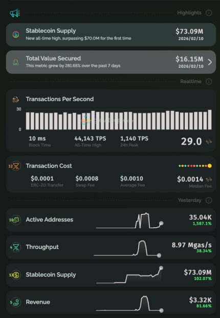 Ein Blick auf die Launch-Day-Zahlen zeigt, wie weit der Weg noch ist. Die USDm-Supply liegt bei 73 Millionen Dollar. Der tatsächliche Durchsatz bei 29 TPS. Das TVL bei 40 Millionen Dollar.