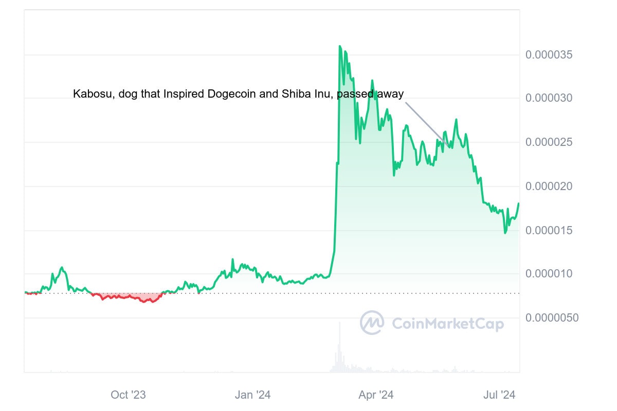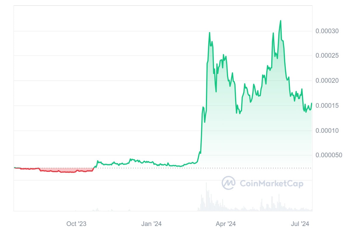 Der Pepe-Token hat seit März eine beachtliche Rally hingelegt und seinen Wert innerhalb eines Jahres fast verfünffacht. Aktuell liegt der Token etwa 44 Prozent unter seinem Allzeithoch von Ende Mai und hat eine Marktkapitalisierung von 4 Milliarden US-Dollar. Ein wichtiger Aspekt von Pepe ist der riesige Token-Supply von über 420 Billionen Token, der letztlich für einen dauerhaft niedrigen Kurs sorgt. Anlässlich des Kursrutsches stellt sich wie immer die Frage ohne Antwort: “Are the Frog Days Over” oder bietet sich gerade eine weitere Kaufgelegenheit?