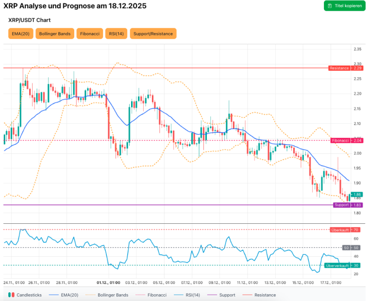 Die kurzfristige Prognose für XRP am 18. Dezember 2025 bleibt neutral bis leicht bärisch. Unterstützungen: 1,82 US-Dollar (Fibonacci-Endpunkt / Bollinger-Unterband) und 1,80 US-Dollar; Widerstände: 1,90 US-Dollar (EMA-20) und 1,99 US-Dollar (Bollinger-Oberband). Ein Ausbruch über 1,95 bis 2,04 US-Dollar (Bestätigung über EMA-20 und Fib-Level bei 2,04 US-Dollar im Abwärtstrend) würde das bullische Szenario eröffnen, während ein nachhaltiger Bruch unter 1,83 US-Dollar zu erhöhten Abgaben und Volatilität führen dürfte. Du solltest kurzfristige Positionen gegen 1,82 US-Dollar absichern und bei Long-Setups eine Bestätigung über EMA-20 und das Bollinger-Oberband abwarten.