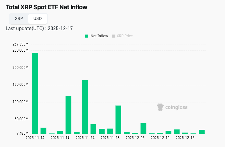Während die Bitcoin und Ethereum ETFs dieser Tage eher Abflüsse als Zuflüsse verzeichnen, schlagen sich die XRP ETFs weiterhin wacker. Seit der Auflage der XRP-Indexfonds sind an jedem Tag netto Gelder in die Fonds geflossen. Am gestrigen Mittwoch, dem 17. Dezember, waren es beispielsweise rund 19 Millionen US-Dollar.