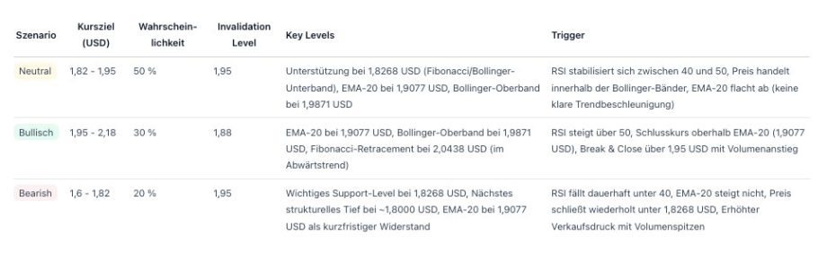 Die Bollinger-Bänder-Breite beträgt 0,16 US-Dollar (Oberband 1,9871 US-Dollar / Unterband 1,83 US-Dollar) und ist damit verhältnismäßig eng. Der Markt befindet sich in einer kurzfristigen Konsolidierungsphase mit erhöhter Unsicherheit, solange der Kurs unter dem EMA-20 bleibt.