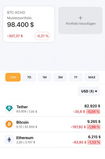 Das vollständige Portfolio könnt ihr euch in der BTC-ECHO App kostenlos selbst nachbauen. Dafür müsst ihr einfach die BTC-ECHO App im App Store oder Google Play Store herunterladen und im Reiter Portfolio alle oben gezeigten Coins hinzufügen.