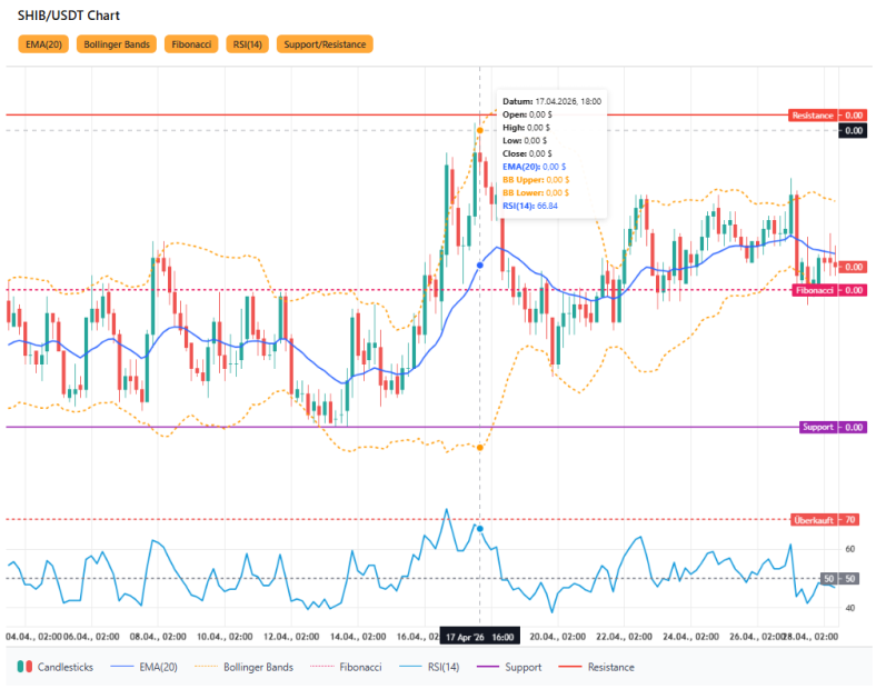 Die Kursentwicklung von SHIB/USDT über mehrere Tage im April verläuft insgesamt seitwärts und ist von kleineren Auf- und Abwärtsbewegungen geprägt. Der gleitende Durchschnitt (EMA 20) verläuft relativ flach, was darauf hindeutet, dass aktuell kein klarer Trend vorliegt. Auch die Bollinger Bänder zeigen, dass sich der Kurs innerhalb einer normalen Schwankungsbreite bewegt, ohne starke Ausbrüche nach oben oder unten.