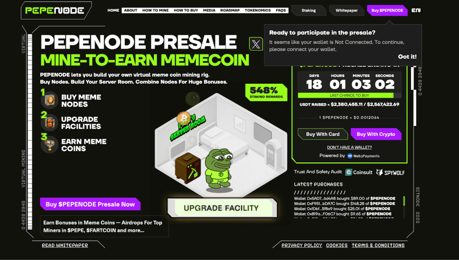 Auch die Marktresonanz deutet auf wachsendes Interesse hin. Mit rund 2,3 Millionen US-Dollar im Presale zählt PepeNode bereits jetzt zu den auffälligen neuen Coins für 2026. Ergänzt wird das Modell durch hohe Staking-Anreize für frühe Teilnehmer. Wer hier dabei sein möchte, kann mit dem Staking noch rund 550 Prozent Jahresrendite verdienen.