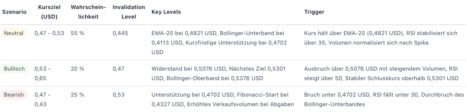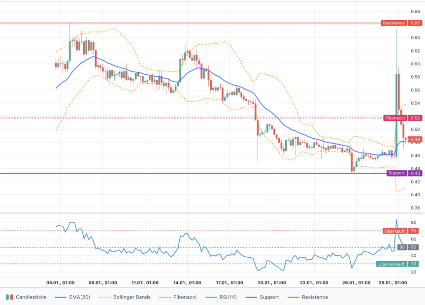 In den letzten 24 Stunden bewegte sich der Kurs in einer Range zwischen dem Hoch von 0,59 US-Dollar und dem Tief von 0,47 US-Dollar basierend auf den letzten vier Kerzen. Der aktuelle Schlusskurs liegt bei 0,4847 US-Dollar und damit leicht unter dem Schlusskurs des Vortags (0,4867 US-Dollar). Die Marktkapitalisierung beträgt etwa 1,34 Milliarden US-Dollar. Auffällig waren starke Volumenspitzen während des Ausbruchs und der anschließenden Abverkäufe, was die Kursbewegung beschleunigte.