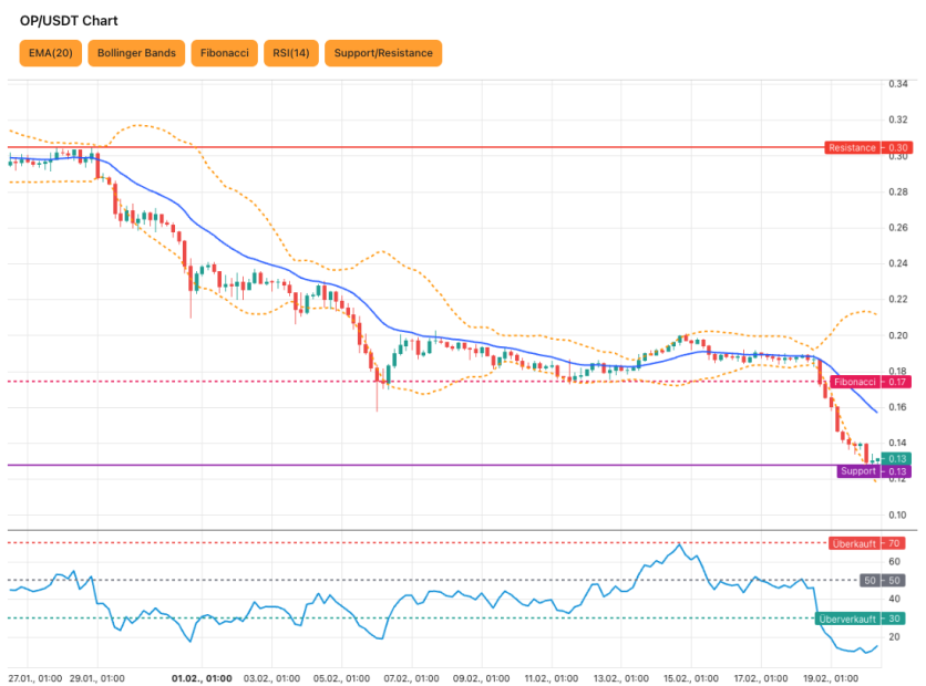 Kurzfristig bleibt die Prognose für OP am 20.02.2026 bärisch bis neutral, da der Kurs unter dem EMA-20 notiert und das Momentum schwach ist. Unterstützungen: 0,1278 USD (aktuelle Struktur) und 0,11715 USD (Bollinger-Unterband).